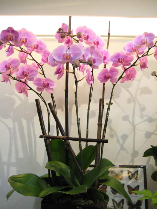 五株連在一起的粉色蝴蝶蘭盆栽,是點綴室內的最佳擺設。只要小心的打理,花期可以有一整個月那般長久。是送給親戚朋友不錯的選擇。
