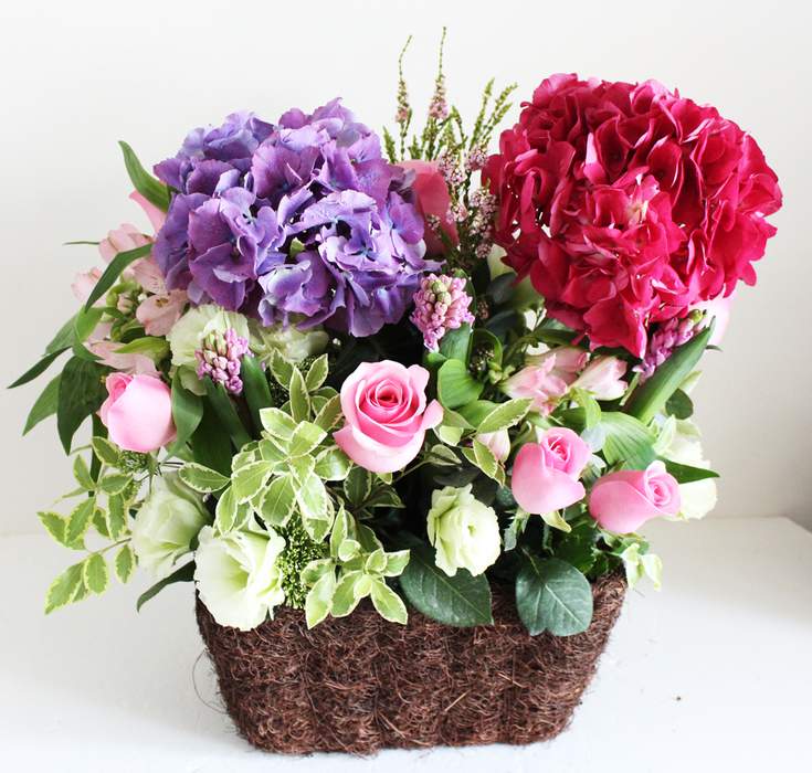 Fabulous, long lasting Hydrangea, fragrant Hyacinths in the most amazing shades of purple. This basket of flowers will delight and impress your favorite flower lover, make a great baby shower or business gift, or provide you with the perfect way to say "congrats!"