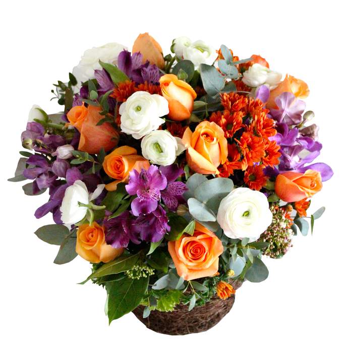 This is a basket arrangement with orange roses and mixed flowers assorted. The cheerful orange and yellow color brighten her up a day!