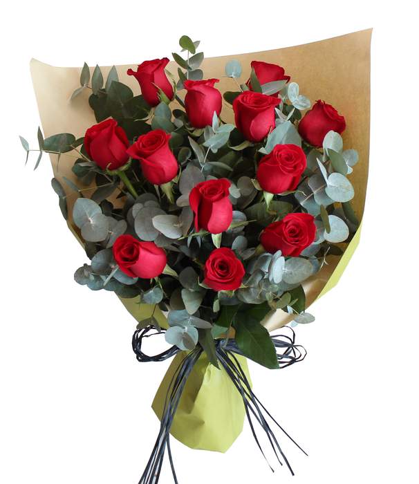 12 American Roses with Eucalyptus
