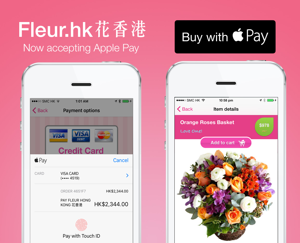 - Apple Pay in app payment with the Fleur Hong Kong iOS app. Apple Pay is available with iOS devices with supporting credit cards.